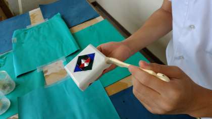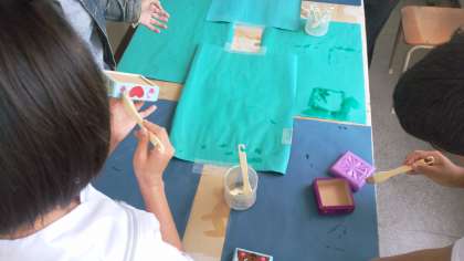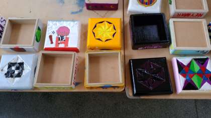 美術の授業では小物入れを飾っています。彫刻と色付け、そしてニスを塗っています。