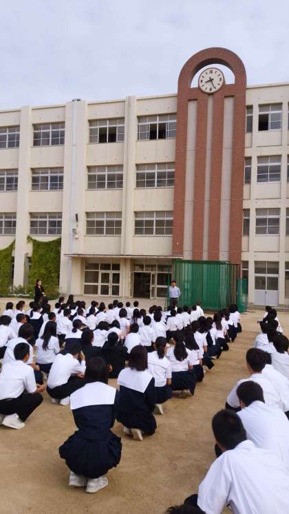 木曜日の定例の学年集会です。今日は3年生が大切なテストですので短時間でとのことで1年生が集会をしています。