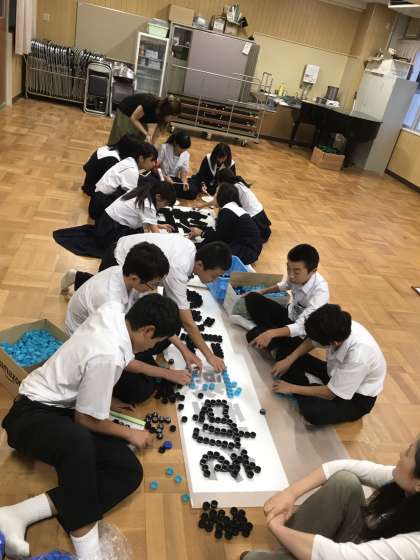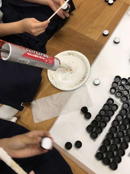 生徒会を中心にキャップアートはいよいよ貼り付けが始まりました。