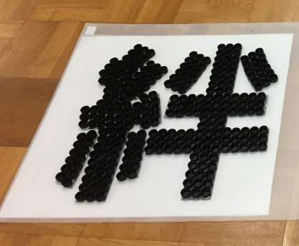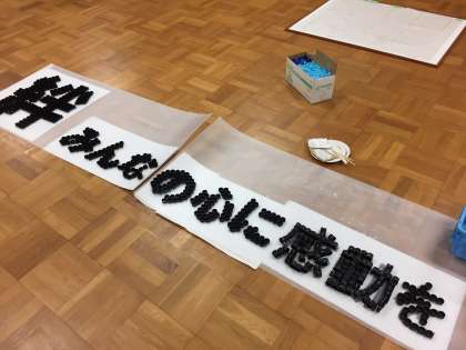 生徒会が進めていますキャップアートの貼り付けが終わりました。スローガンがはっきり浮かび上がりました。