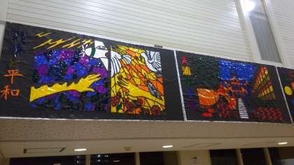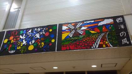玄関に飾られた3年生の作品は、玄関ホールの照明に照らされ、先ほどとはまた違った様子を見せてくれています。