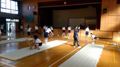 男子体育は、グラウンドで高跳び。女子体育は体育館でマット運動をしています。