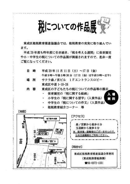 「税を考える週間」として、サクラ森ノ宮ビルにて11月11日〜17日まで本校の作品も展示されます。