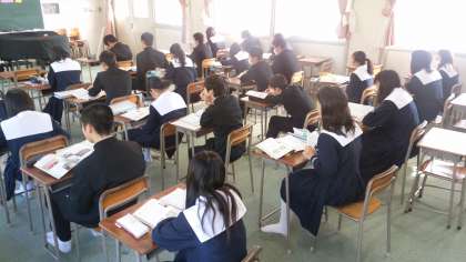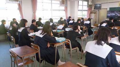 音楽の授業では、映像を視ながら、楽器の演奏の仕方や表現で、曲の情景を表している解説を聞いています。