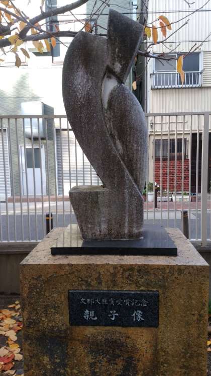 昭和39年9月22日に文部大臣から表彰を受けた記念し建てられた親子像は、子どもをしっかりとそして優しく抱き締めている形を現しています。
