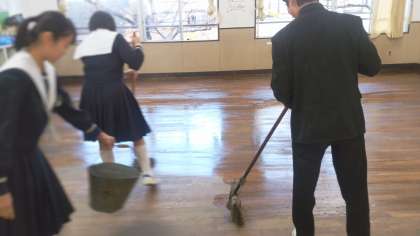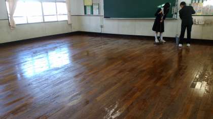学期ごとに行われます教室の油引きです。これをすると、砂埃が随分違います。