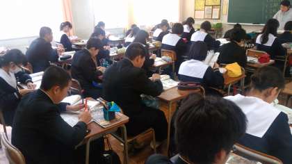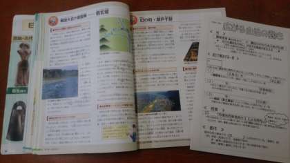 戦国時代のものの考え方や起きた出来事を学んでいる2年生の社会では、プリントなどを使って授業を進めています。