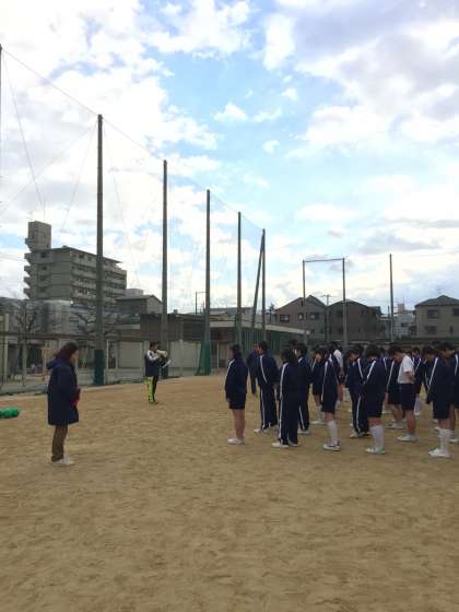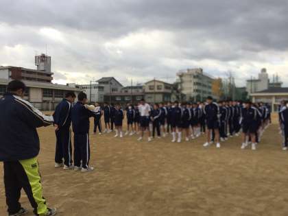 まずは開会式。寒さの中、怪我のないようにしっかり準備運動します。