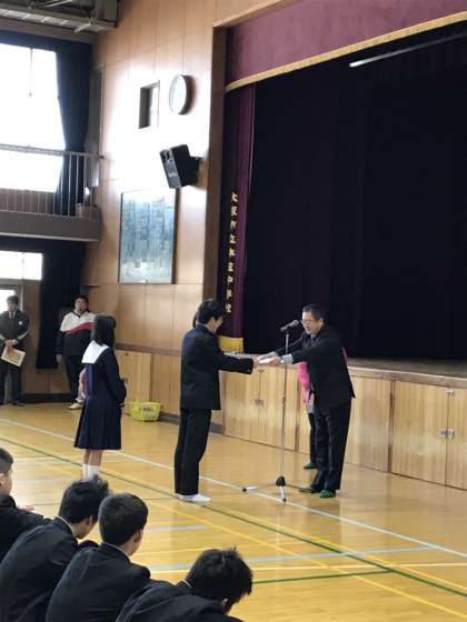 英語暗唱大会の表彰も行いました。緊張して挑んだことを思い出しながら、校長先生から賞状を受け取ります。