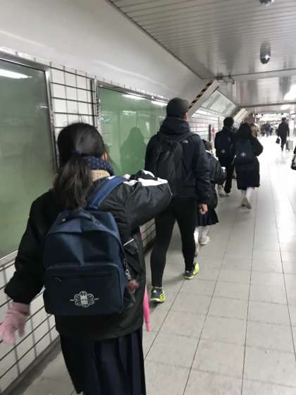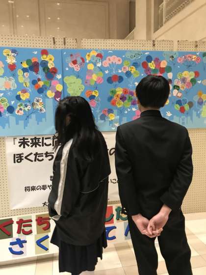 大阪市役所で行われています、大阪市中学校特別支援学級特別支援学校生徒作品展に出展しています生徒達が、見学に行っています。