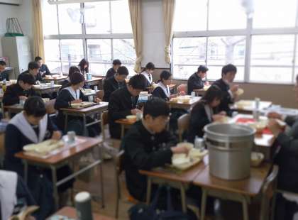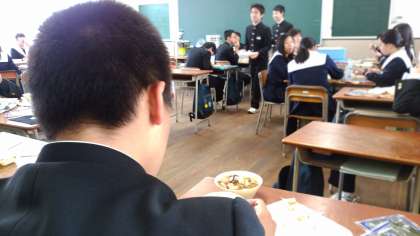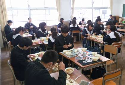 大掃除を終えた後の和やかな雰囲気の中、昼食を採っています。