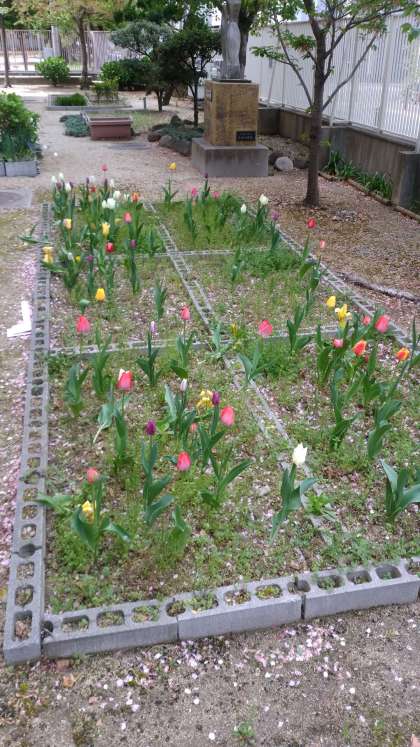 目を引くのがチューリップ。その他にも色とりどりのお花があります。