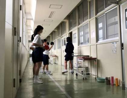 4月17日(火)放課後 卓球部は格技室以外でも練習をします。 まずは素振りから。