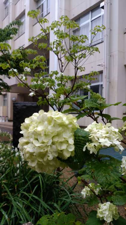 雨の朝、もうアジサイかと思ってしまう白い花が玄関近くに咲いています。