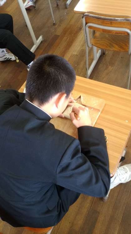 美術では、木製の印章ケースに彫刻刀でデザインを施しています。