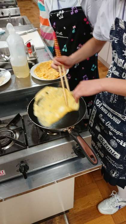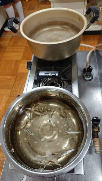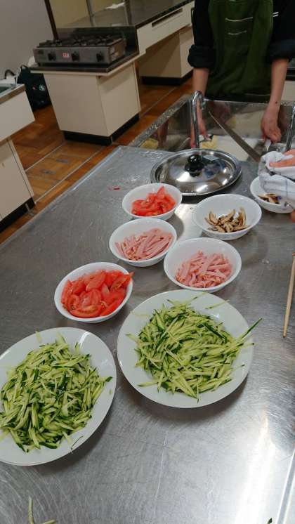 家庭科部と茶道部コラボ、調理実習でソーメンを作っています。キュウリを切るのから一苦労ですが、出汁を作り、薄焼き卵に四苦八苦しています。