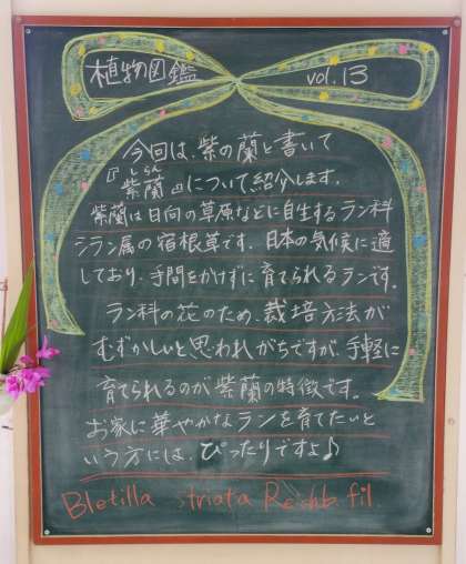 本館のグラウンド側に、植物に関することが書かれた黒板があります。季節によって様々な草花が紹介されています。