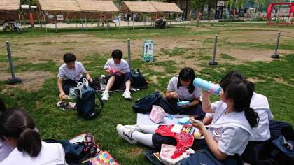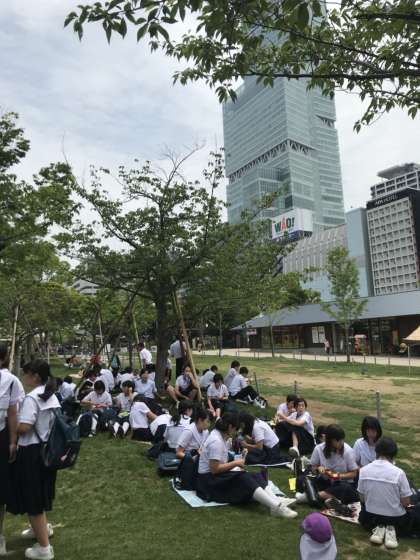 天王寺公園「てんしば」にて、お弁当を食べています。