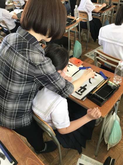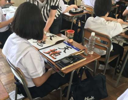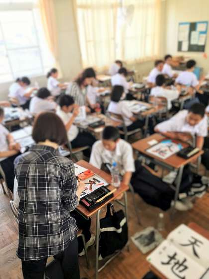 「天地」という字を練習しています。筆の運び方から、文字の特徴を知り、良い字を書き上げていきます。