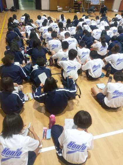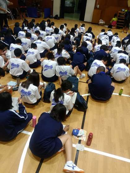 レクリエーションも終え、今日の反省会を行っています。まずはしおりに今日の事を書きとどめています。