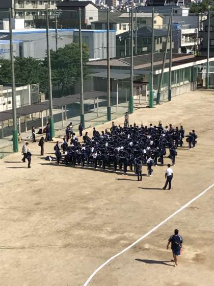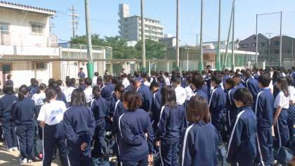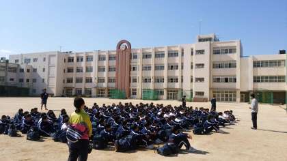 一年生は先程学校に到着し、グラウンドに集合しています。