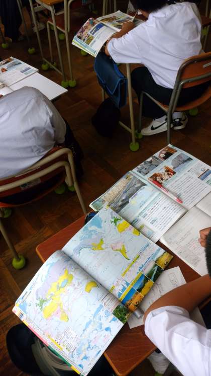 社会では寒い地域の暮らしを学んでいます。食べるものを商店で売っています。あまりにも寒いので、すべて凍っています。