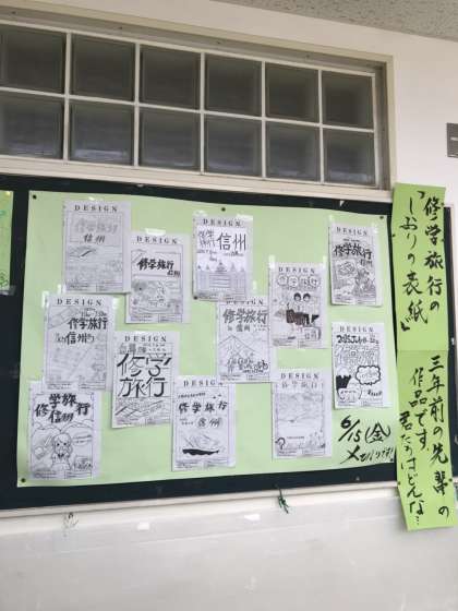 修学旅行前でもある3年生。廊下にはしおりの表紙を募集する案内が出ています。