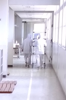 この時間、給食配膳員さんが各階に配膳していただいている様子です。