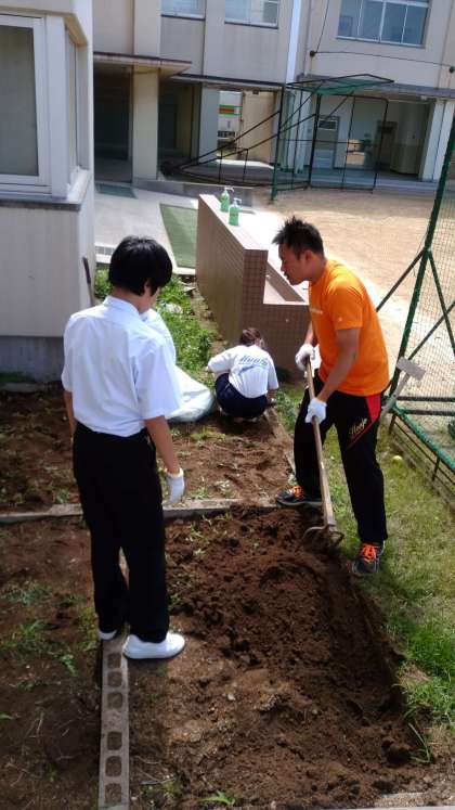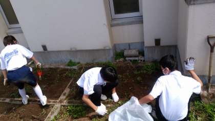 支援学級では農園作業を前に、畑の雑草を除去しています。