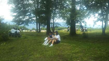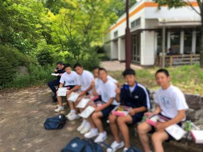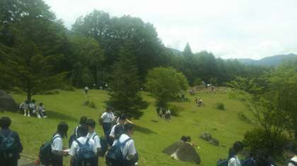 長野県駒ケ岳サービスエリアで昼食を採っています。とてもいいお天気なので芝生の上での昼食です。みんな思い思いの場所で、お弁当を食べています。