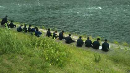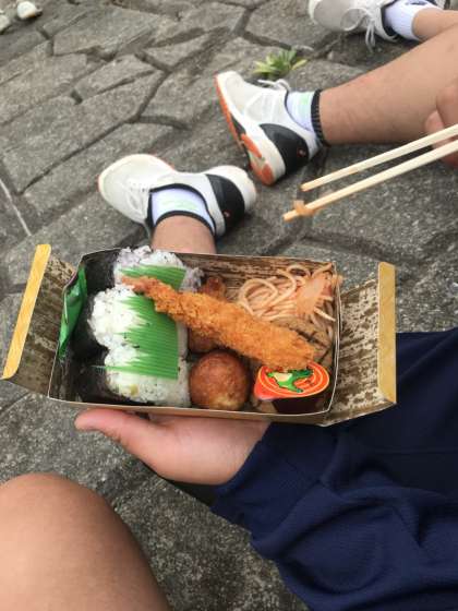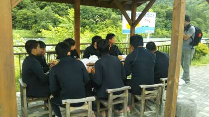 シャワーウォーキングやキャニオニングを午前中に体験した人は、ライフジャケットを着たまま食事をします。