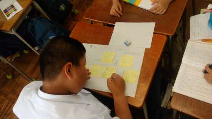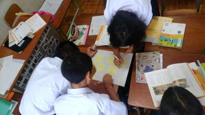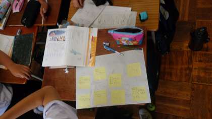 物語を読んで、登場人物の相関関係を話し合って、付箋図にしています。