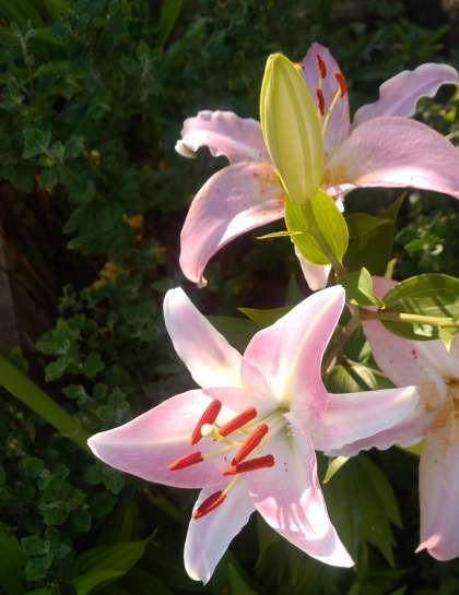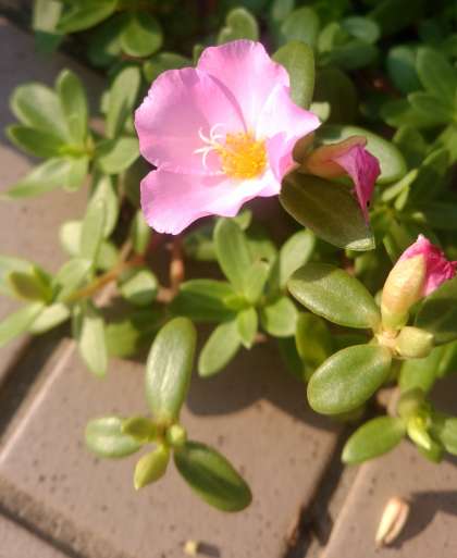 朝の陽ざしを受けて、玄関の花が大きく花びらを広げています。