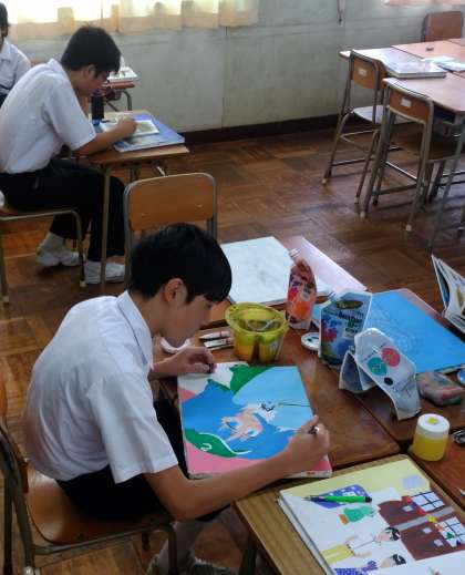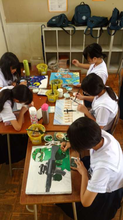 教室を借りて活動しています。美術部の夏休み中の活動はこれで終わりですので、今日はこの後片付けて掃除もします。