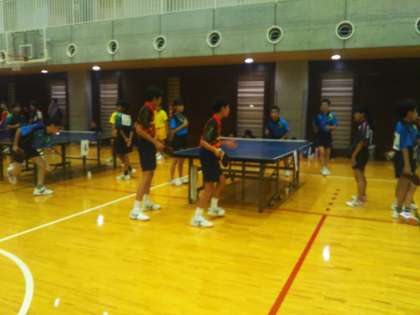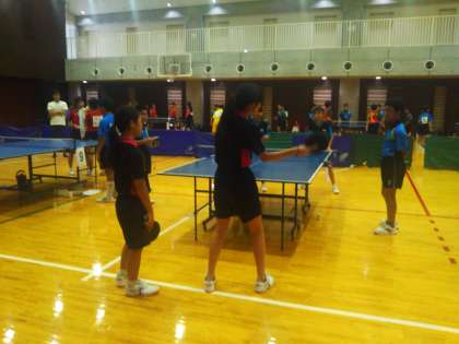 昼休憩をはさみ、午後からはダブルスの練習試合を行っています。約50組のペアが13リーグに分かれ、午前中に学んだことをふまえつつの、総当たり戦を行います。