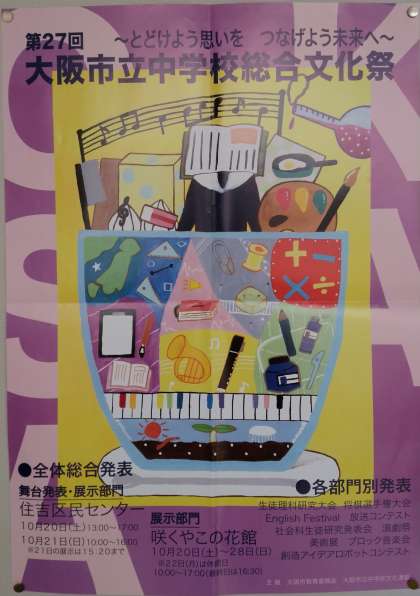 本校からも、家庭科部や美術部、美術の授業作品、茶道、華道、英語部などが参加します。今年は例年と場所の違う展示会場もありますので、詳細が分かり次第、このホームページでもご紹介します。