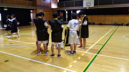体育館で法被姿になる2年生。どちらもどんなものが出来るのかとても楽しみです。