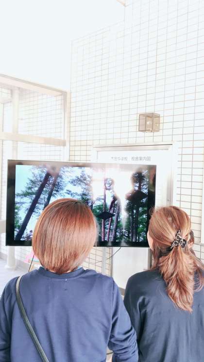 写真は玄関。大型テレビで修学旅行の写真などが映し出されています。