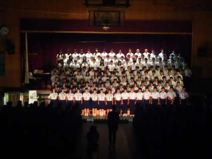 いよいよ最後のプログラムとなりました。3年生による、「結」の全体合唱です。