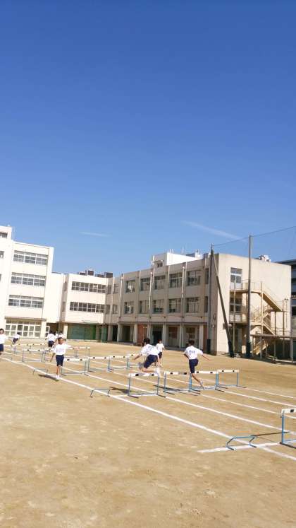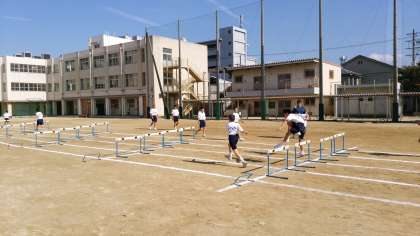 1年生の男子はグラウンドでハードル競技を学習しています。