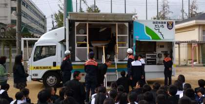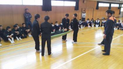 防災教室では、毛布などで簡易型の担架ができることや、起震車での体験をしています。