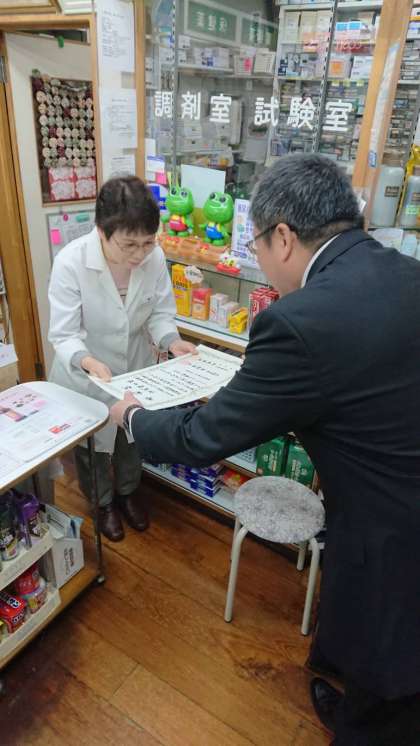20年もの長きにわたりご活躍をいただいています、学校薬剤師の先生に、大阪市から表彰状が出ましたので、学校長が薬局まで行ってお渡ししてきました。