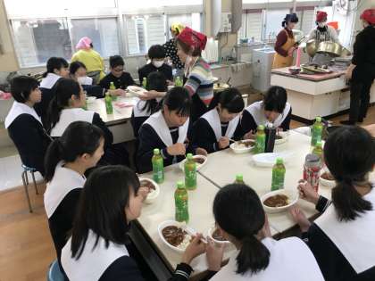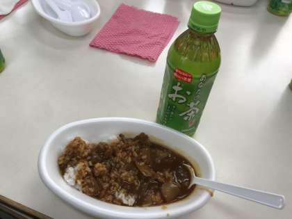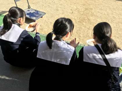 東中本ふれあい祭りの準備を進めている吹奏楽部員は、お昼ごはんのハヤシライスを戴いています。