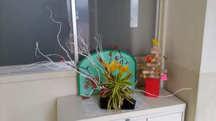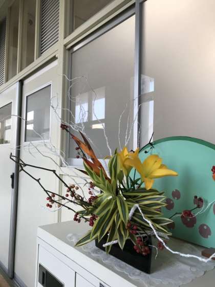 咲いた花をアレンジして、新しく華やかに校長室前が飾られています。