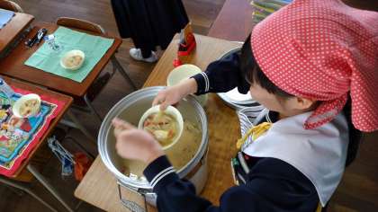 本日の給食のメニューに「雑煮」が出ました。関西地方では京都の白みそを使った雑煮が一般的とされていますが、大阪市内中心部の「船場」では、元旦に白みそで二日にはおすましだそうです。これも「飽きない【商い】あきない」にかけた言葉らしく、諸説ありますが、えべっさんまでは集金しないなどのお商売を中心に考えた大阪人らしさだという逸話でしょうか。