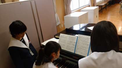 多目的教室に置かれたグランドピアノを使って合唱コンクールの練習をしている生徒もいます。