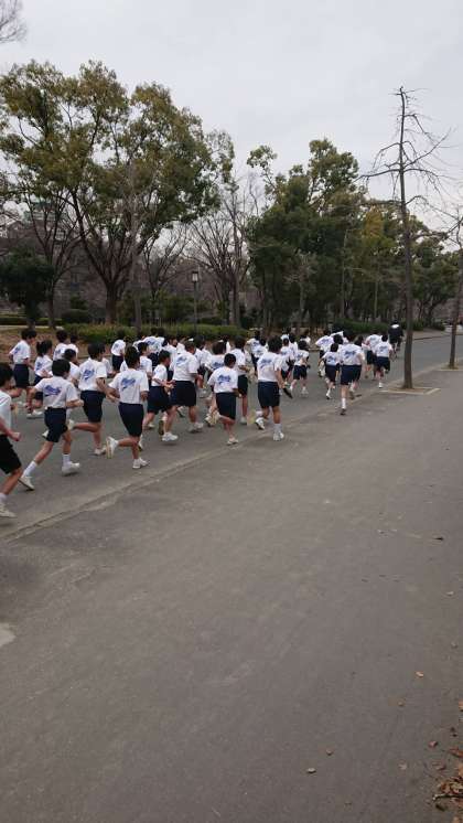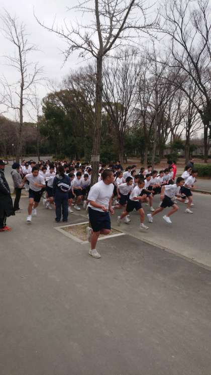 大坂城公園に到着した参加者は準備体操をし、いよいよスタートをしました。写真は1年生です。