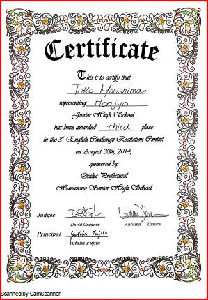8月30日(土)に行われた表題の暗唱大会で,3年2組森嶌稲子さんが3位入賞しました。おめでとうございます。森嶌さんは,9月23日(火)の大阪市長杯暗唱大会に出場します。さらに練習して次回も入賞してください。