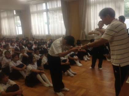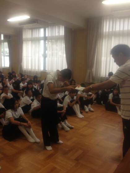 少し寒いので表彰式は制服に着替えてから,多目的室で行いました。