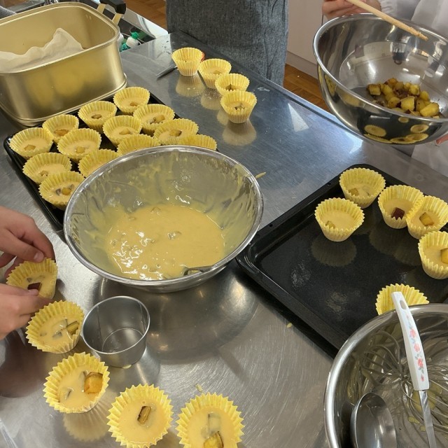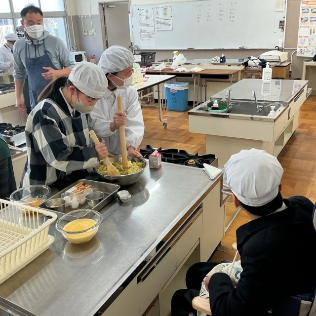 さつまいもを洗ったりつぶしたりする工程にも意欲的に取り組み、友だちや教員と声をかけ合いながら、楽しく調理を進めることができました。